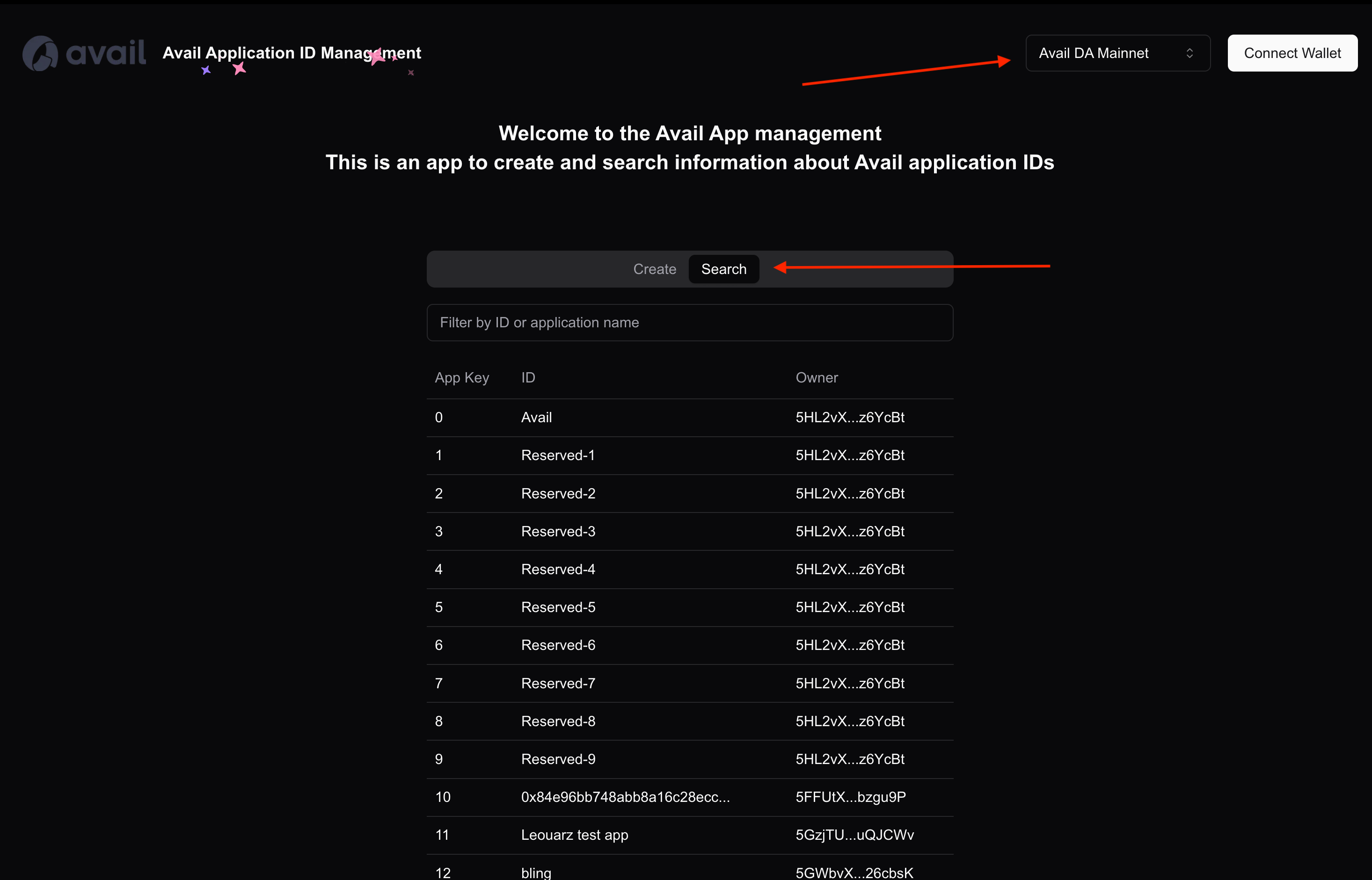 1. Go to appid.availproject  and select the correct network from the dropdown.