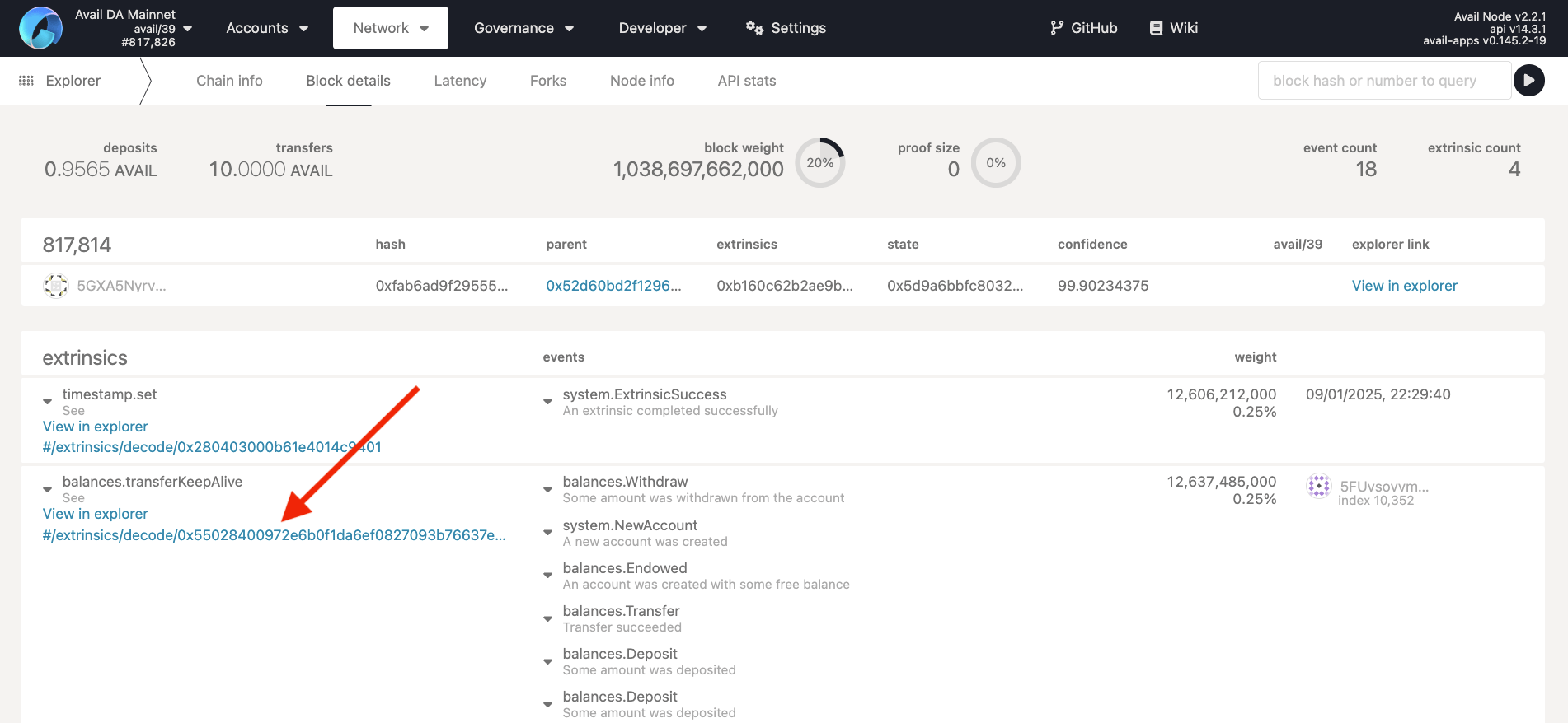 1. And that’s it. You just used the AvailApps explorer to query the balance of an account on the Avail network. You can query other methods in a similar way.