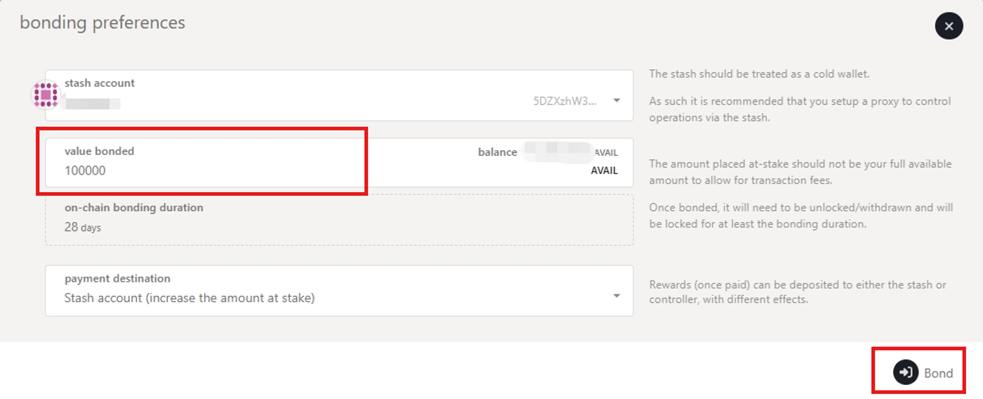 Don’t bond all your AVAIL tokens as you’ll need some for transaction fees. You can always bond more tokens later. Note: Withdrawing any bonded amount is subject to the duration of the unbonding period.