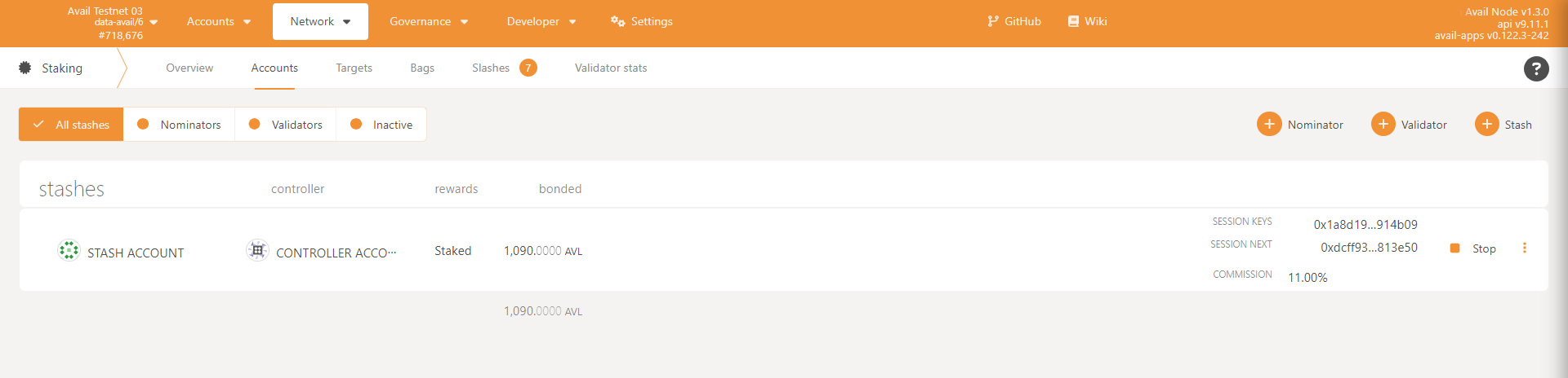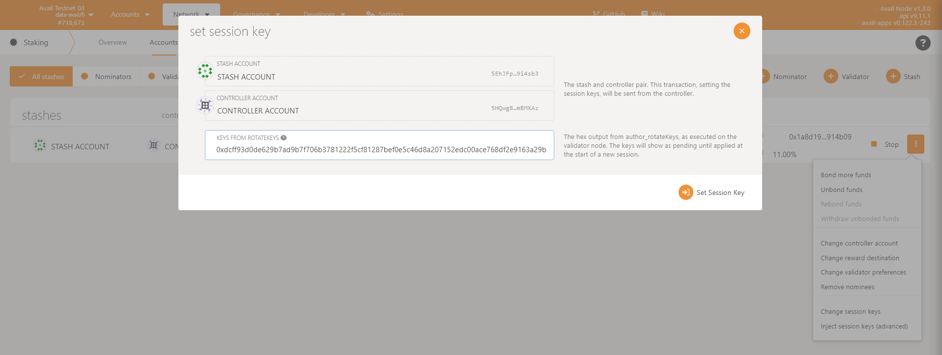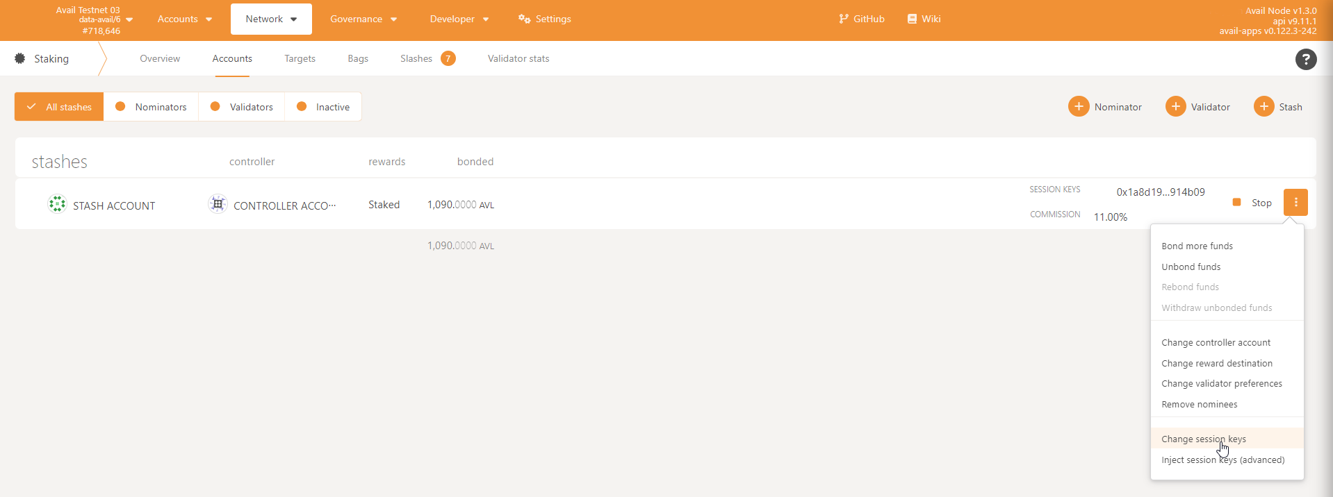 - Open Avail Apps and navigate to Network → Staking. You will be able to select from a hidden menu the option to change session keys.