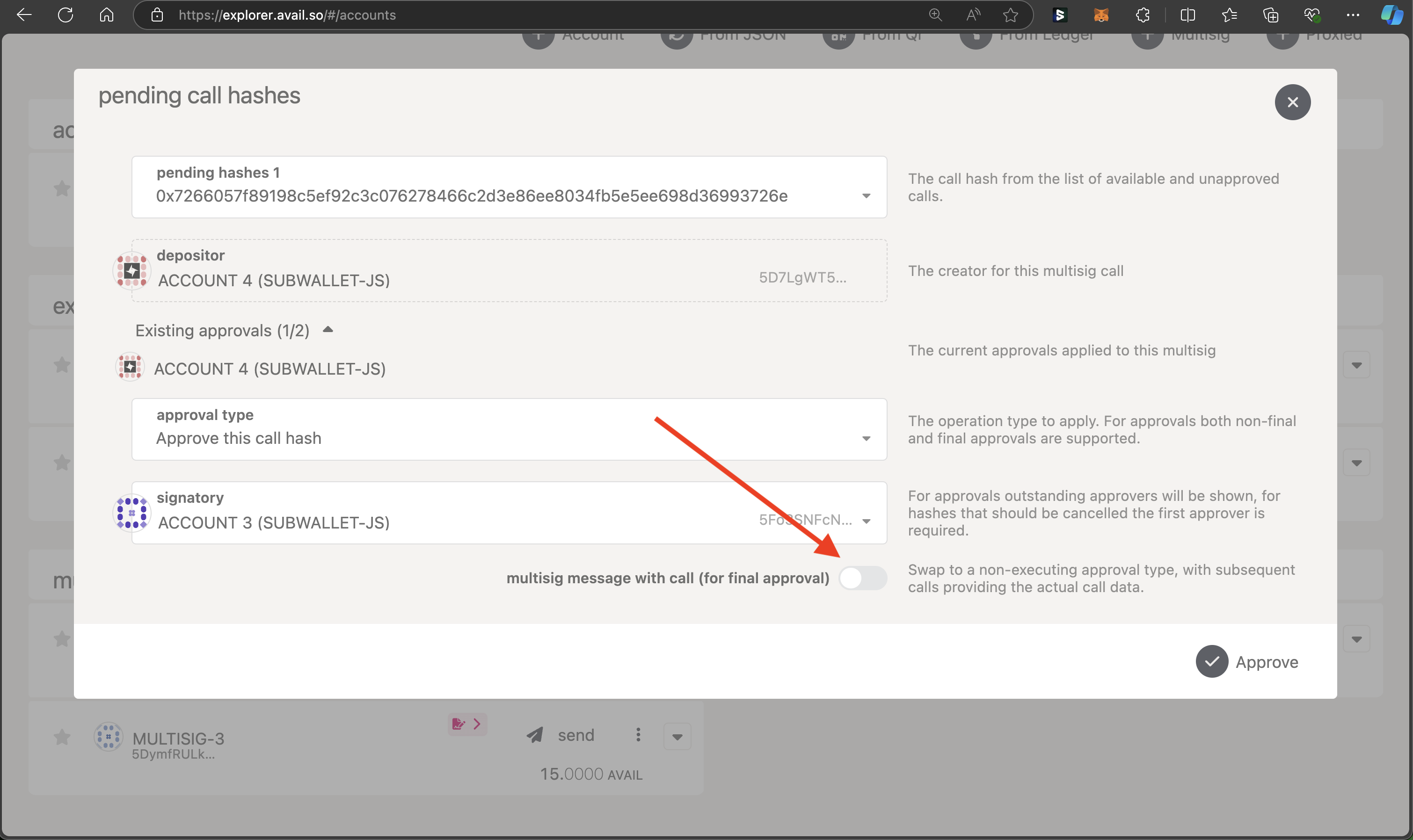 But what if you simply want to approve the transaction without executing it? Avail DA’s multisig implementation allows for this functionality too. Let us say you are the final signatory whose approval will mean the transaction has enough approvals to be executed.