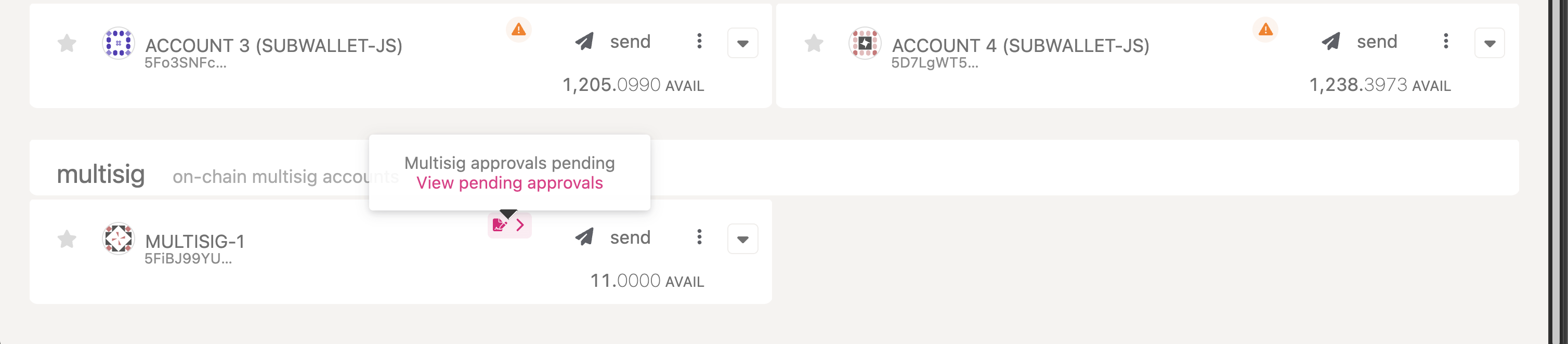 You will see a pink icon next to your multisig wallet that indicates a pending transaction. Click on ‘View Pending Transactions’ to take a look. Click on approval type to simply approve or reject the transaction.