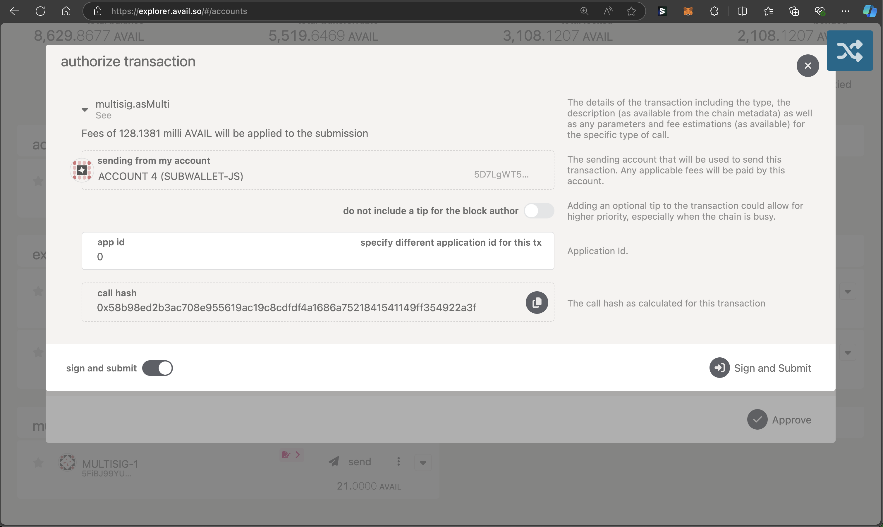 3. Then, click on Sign and Submit and execute the transaction.