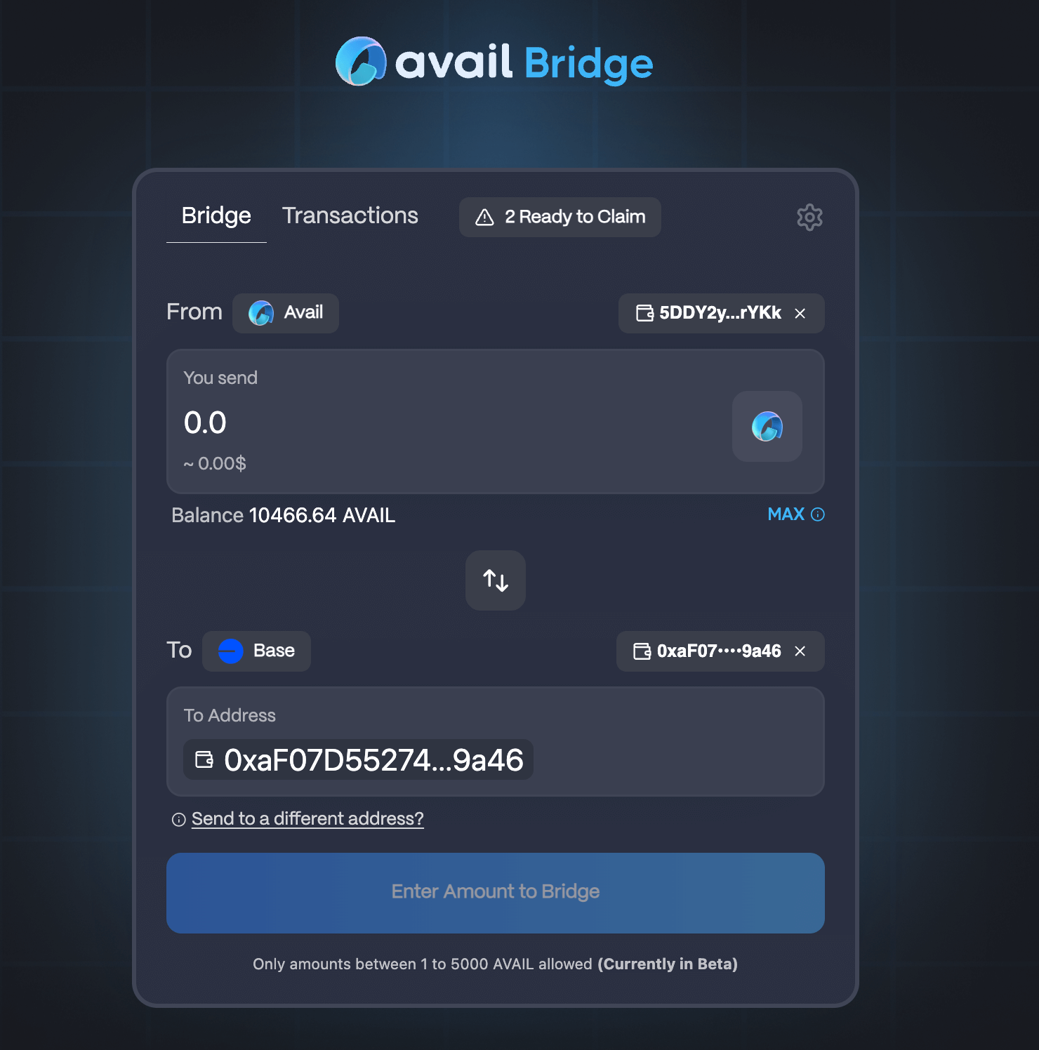 The bridging process between Avail & Base takes around 5 minutes and the funds are sent automatically to the user on the destination chain.