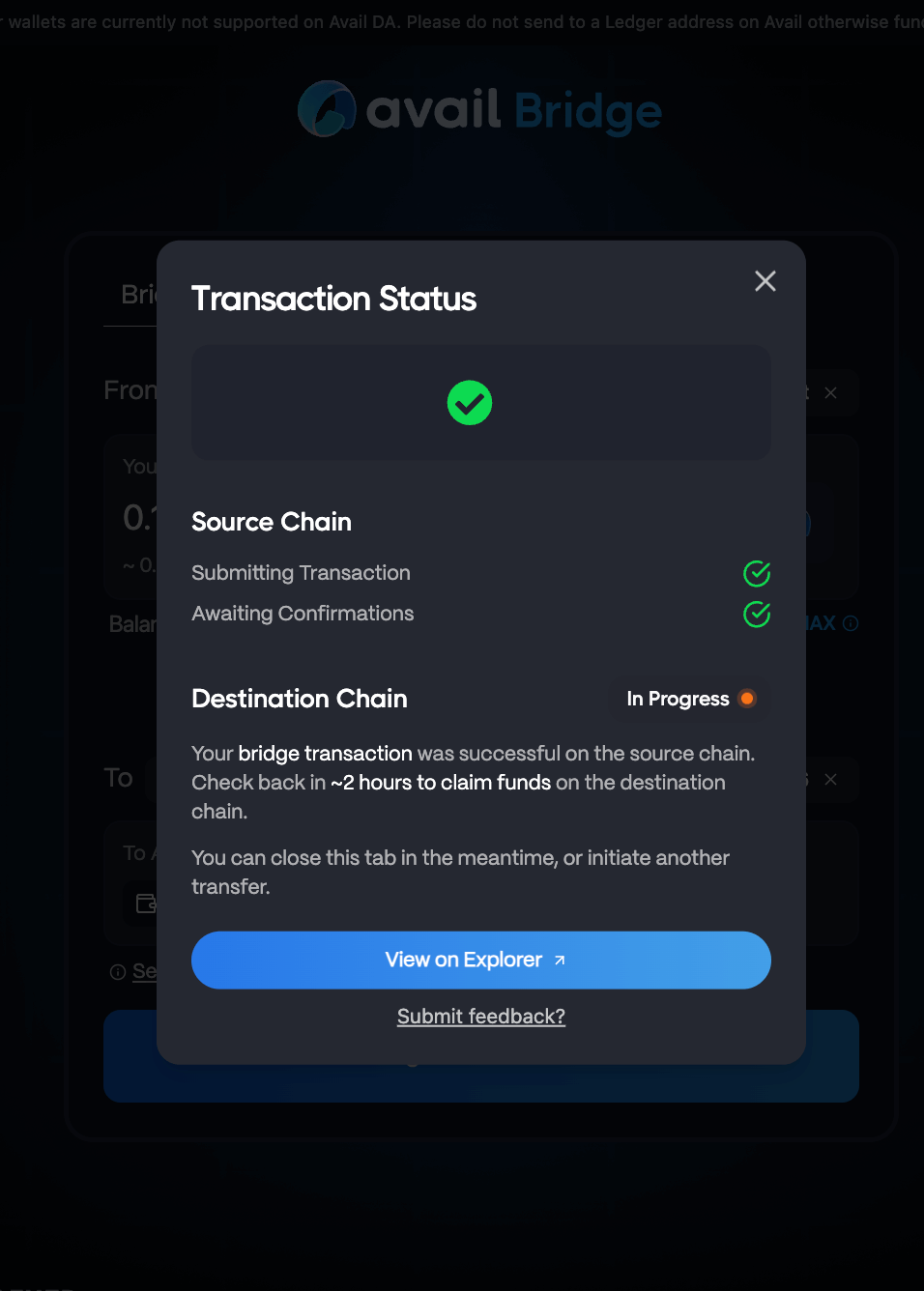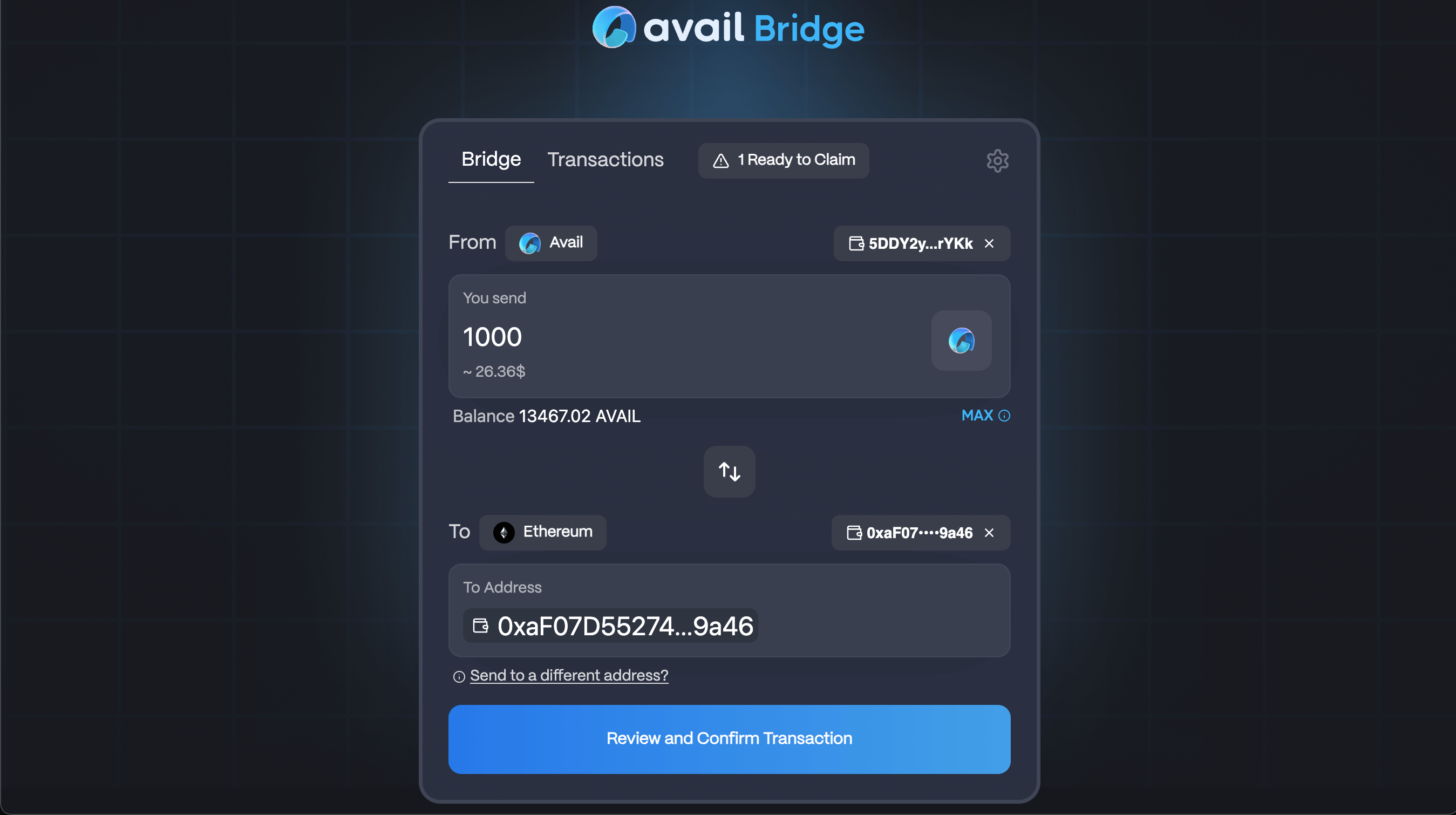 Your funds will take a couple of hours to bridge, following which you need to go to the bridge UI once again and manually claim your AVAIL tokens on the other side.