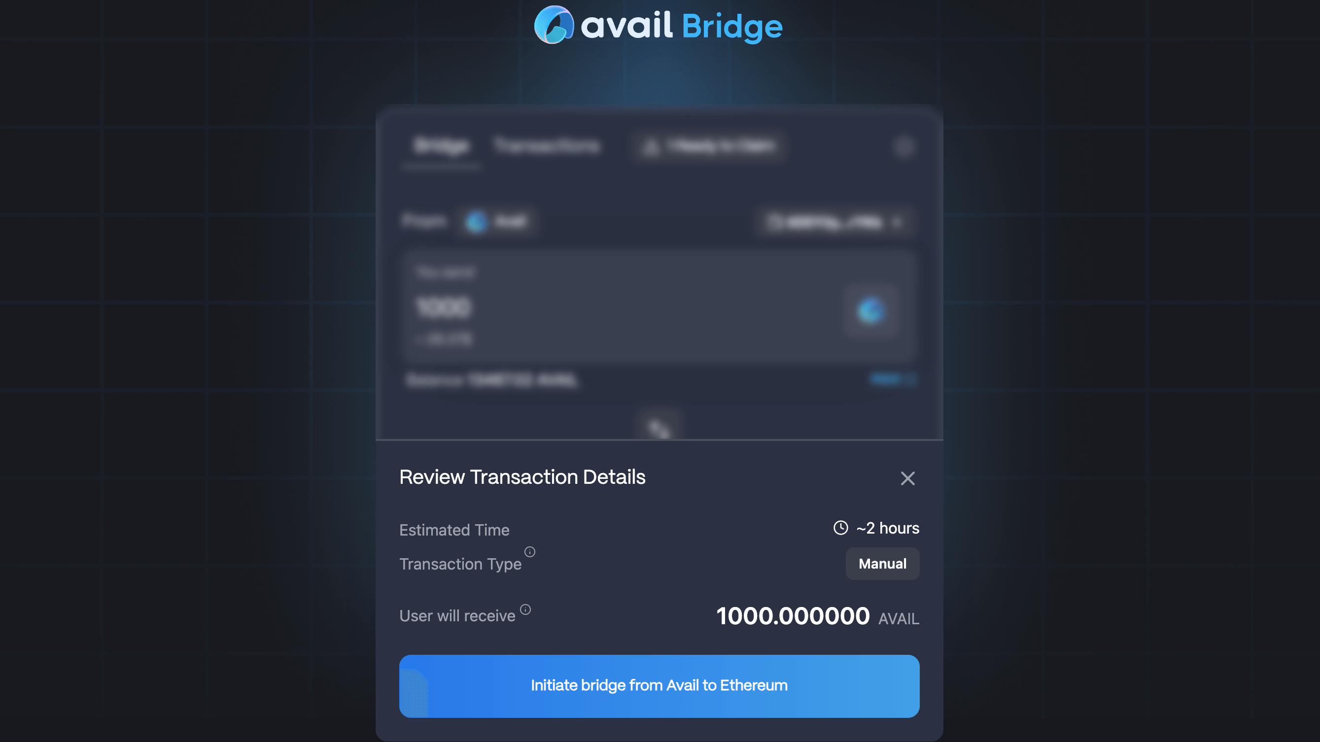 Bridging AVAIL from Avail DA to Ethereum typically takes 1-2 hours. You can check the Transactions tab in the UI to see the status of your transaction. Wait for the transaction status to change to Claim Ready.
