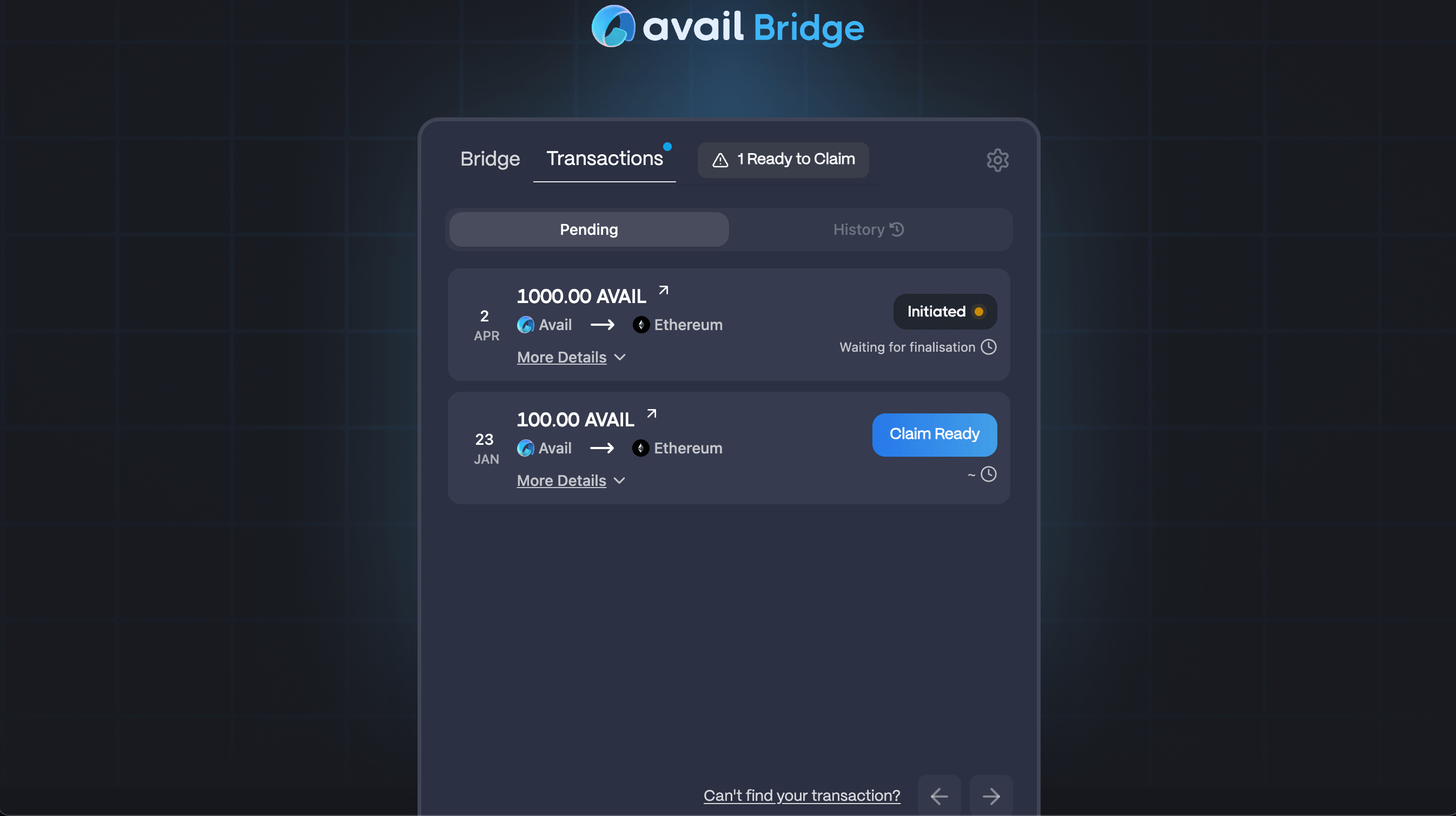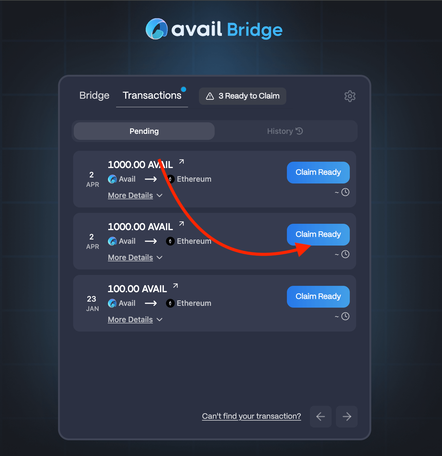 • The Avail bridge UI currently only supports bridging AVAIL tokens between Avail DA and Ethereum. If you initiate the bridging process from Avail DA and want to claim your AVAIL tokens on Ethereum, you need to go to Transactions tab and claim AVAIL by making sure your EVM wallet is connected to Ethereum mainnet, and clicking the Claim Ready button. Conversely, if you initiate the bridging process from Ethereum and want to claim your AVAIL tokens on Avail DA, make sure your Avail wallet is connected to Avail DA mainnet, and click the Claim Ready button.