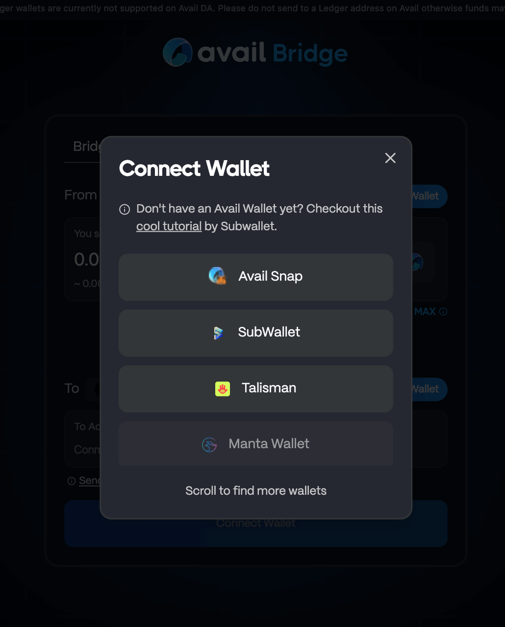 • We have received some reports of an edge-case where it is possible for users to sign the claim transaction on an EVM network like Avalanche through our UI. Please note that this is a bug, and users should only sign transactions on Avail DA or Ethereum mainnet. If you have signed a transaction on the wrong network, you might need to clear the bridge UI’s cache data in your browser. You can find instructions on how to clear cache for a particular website in this blog .