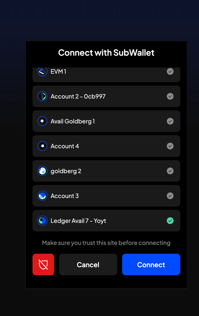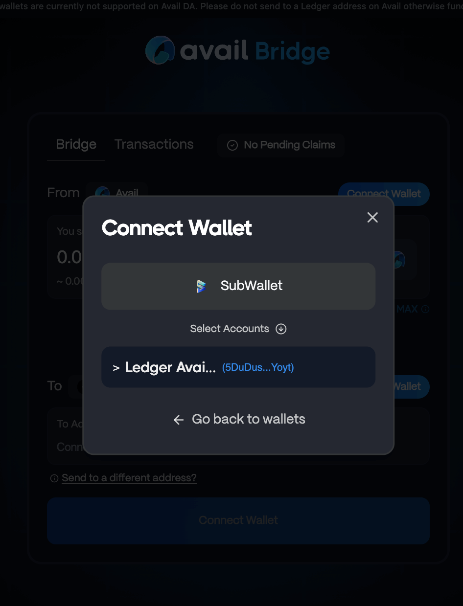 Please note that this is required because Avail DA and Ethereum use two different address formats. The funds on Ethereum will be claimable only by the EVM address you connect here.