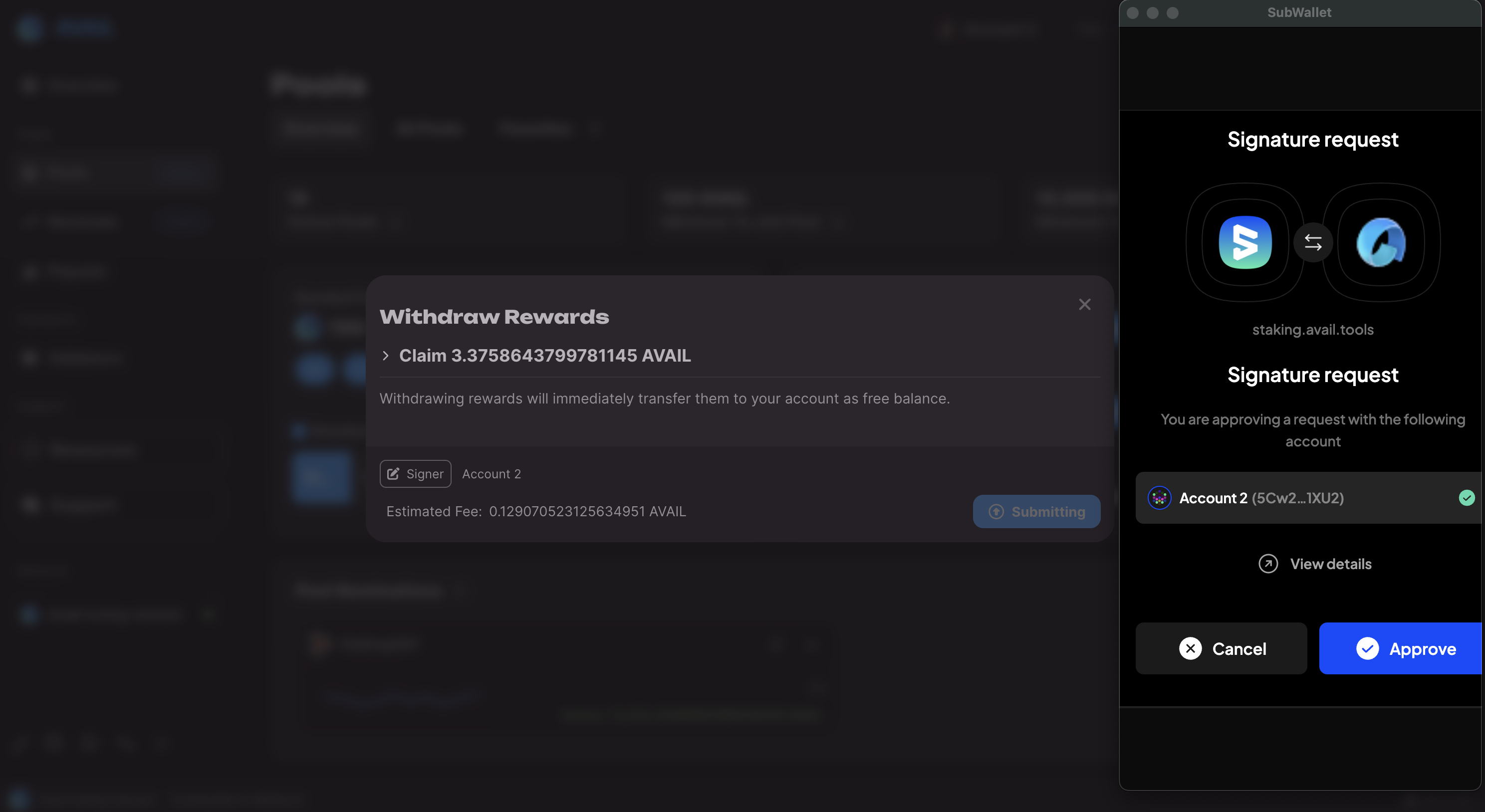 Once you have configured your settings, you can join the pool with any amount ≥ 100 AVAIL. Simply click on Join Pool and approve the transaction.